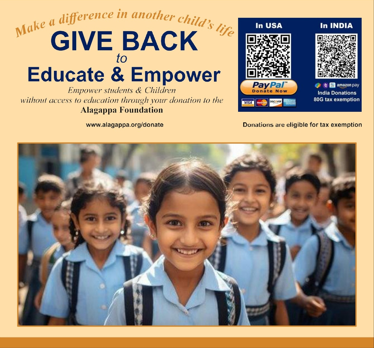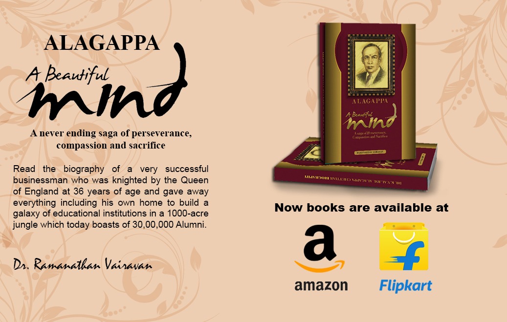 The Minister M. P. Swaminathan urged that April 6, Vallal Dr. Alagappa Chettiar’s birth anniversary, be declared a state festival during the question hour in the tamilnadu legislative assembly. He praised Alagappa’s vast contributions to education and national service, including donating aircraft during wartime. A proposal to include his life in school textbooks is under review by the Chief Minister. | | | | | | | | | | | | PROF. SHRI RANGA NARAYANAN UNIVERSITY OF FLORIDA, USA AC Tech, Chennai 1971 | | S.KOVENTHAN IFS DIRECTOR Ministry of External Affairs, New Delhi Alagappa Matriculation, Chennai 2002 | | R. VIKRAMAN