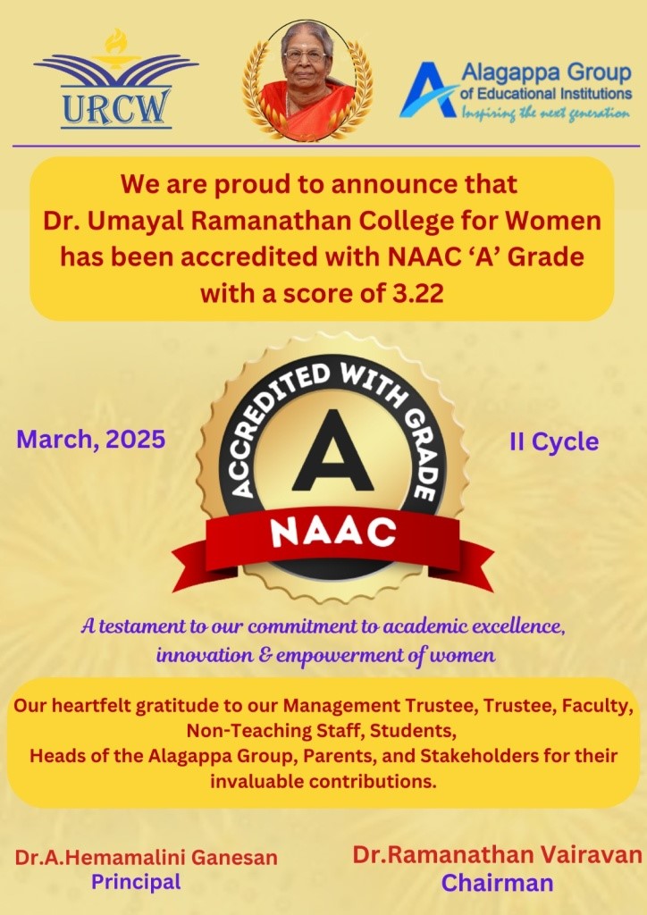 DR.UMAYAL RAMANATHAN COLLEGE FOR WOMEN Earns Prestigious NAAC ‘A’ Accreditation | In March 2025, Dr. Umayal Ramanathan College for Women earned NAAC 'A' accreditation, a proud milestone in its journey of excellence. This honour highlights the institution’s dedication to quality education and continuous growth. It stands as a testament to the hard work of faculty, staff, and students alike. |